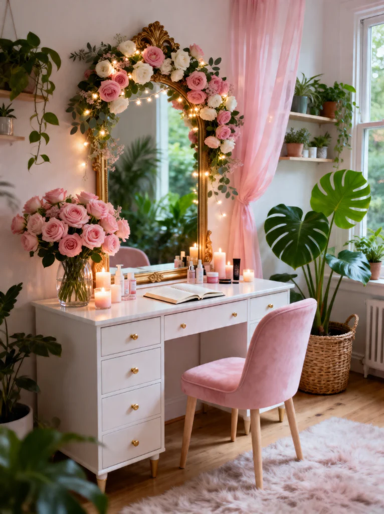 Finally, we have the “Plant Parent” version of a vanity. If you love greenery but still want that feminine touch, this is your goal. The gold-rimmed mirror draped in fresh roses and ivy is a DIY project waiting to happen. It turns a standard white desk into a piece of art.
