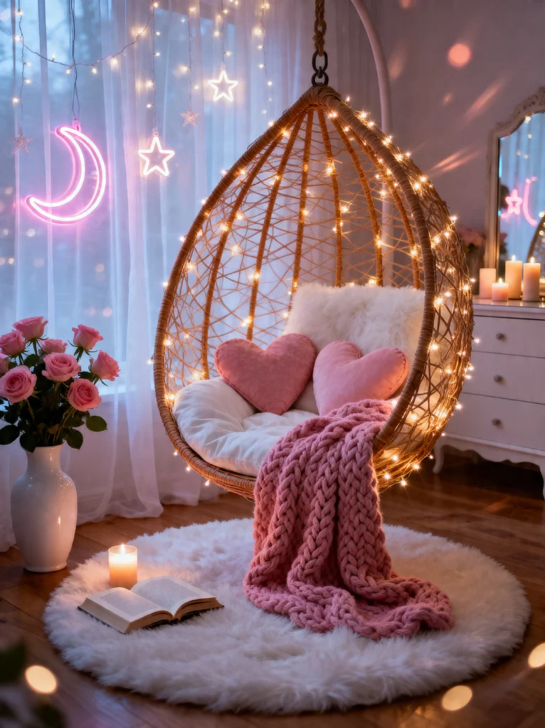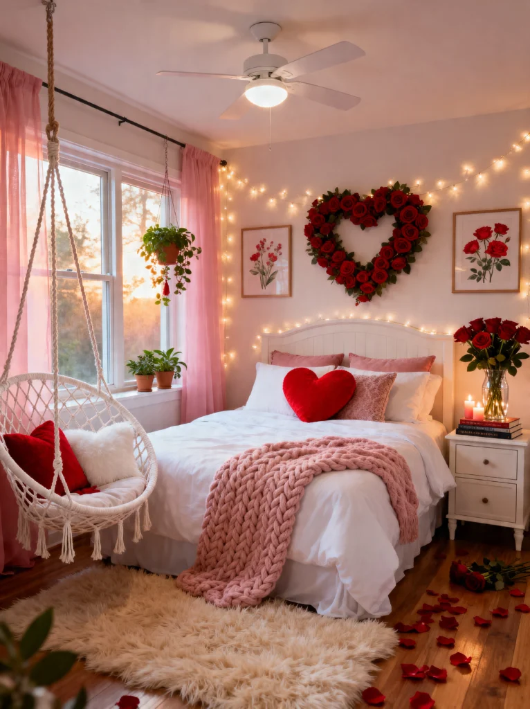 This room feels like Valentine’s Day year-round in the best way possible. It’s soft, feminine, and incredibly romantic. The mix of the white macramé swing chair with those bold red velvet pillows is a masterclass in “Pop of Color.”