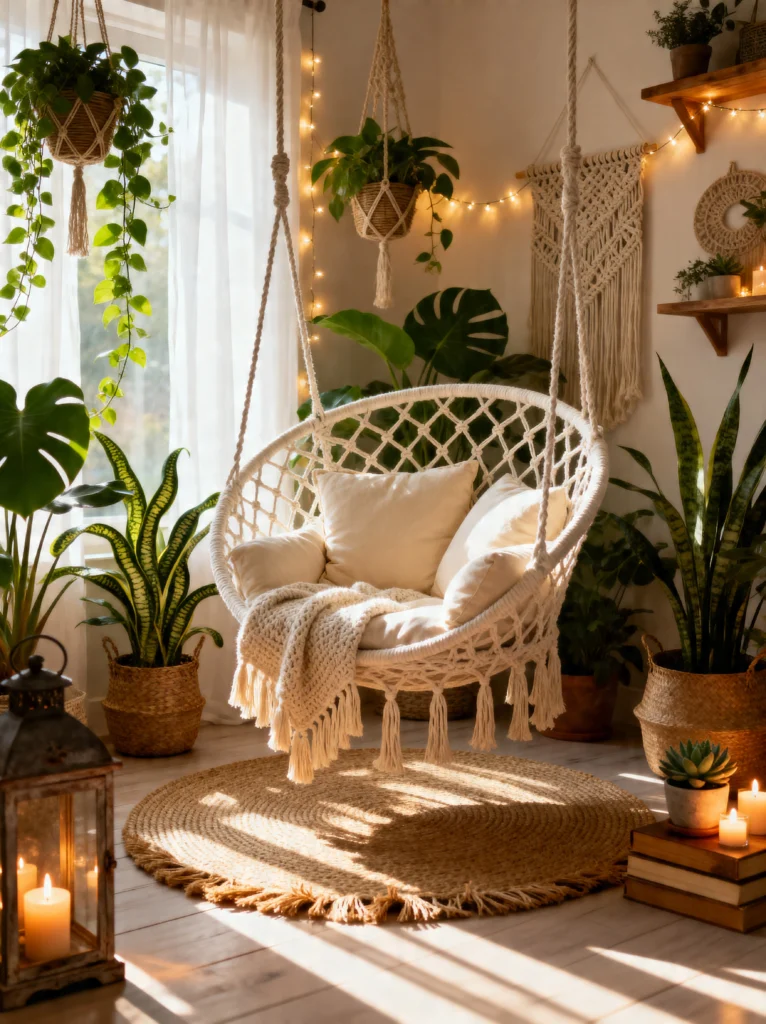 This room is basically a greenhouse you can sleep in. If you ever feel like you need more nature in your life, Image 3 is your blueprint. The way the sunlight hits that macramé swing chair makes me want to drop everything and take a nap immediately.