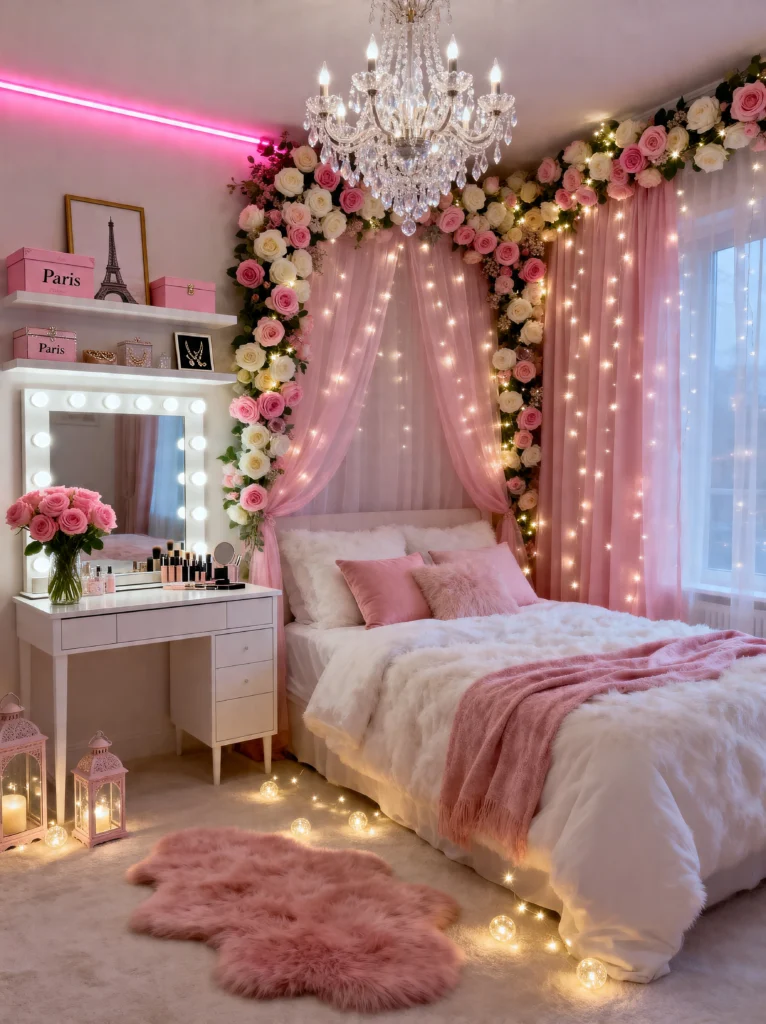 The vanity area is a dream come true for anyone who loves makeup. Those Hollywood-style bulbs give the best lighting, and the pink “Paris” storage boxes are such a cute way to hide the clutter. But the real showstopper is that floral canopy. Mixing white and pink roses with fairy lights creates such a soft, ethereal glow. It’s high-maintenance, sure, but the payoff is a room that feels like a literal dream. If you’re going for this look, remember: more is more! Layer those faux-fur rugs and don’t be afraid of a little (or a lot) of pink.