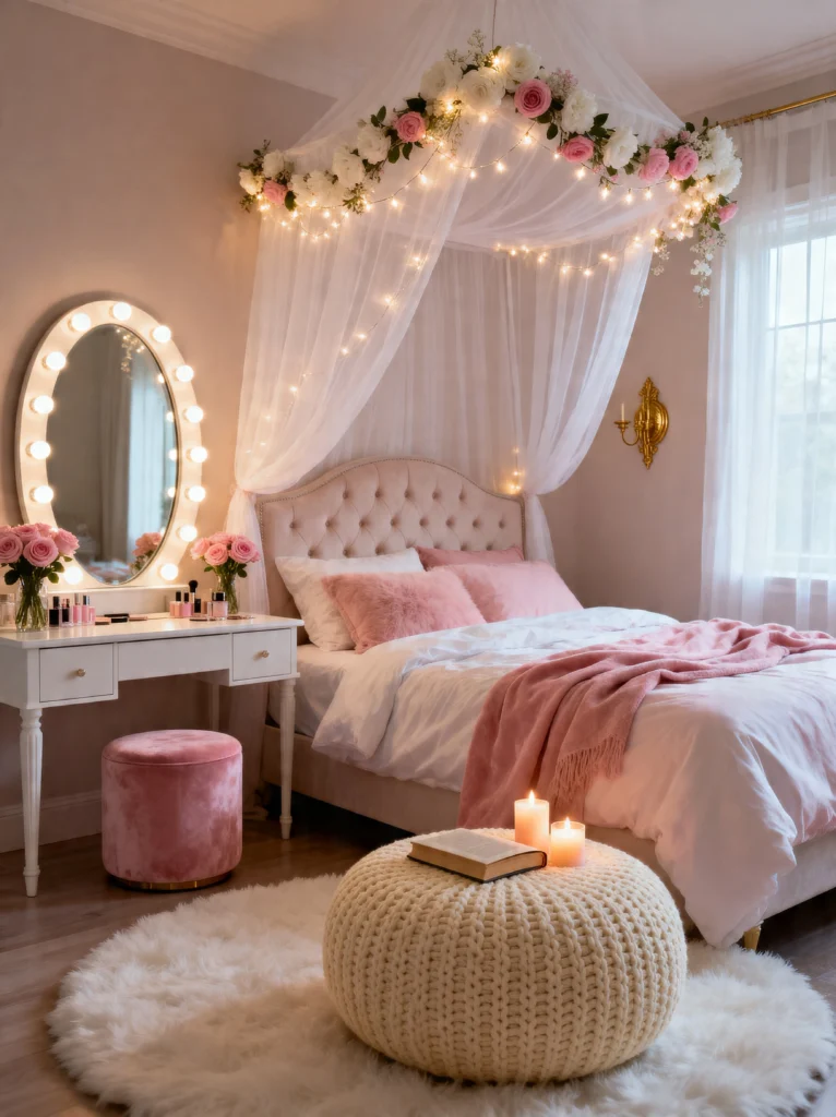 I really love the use of the oversized knitted pouf at the foot of the bed. It’s a great way to add extra seating or a place to set your books without taking up too much visual space. The sheer canopy with the rose garland is so delicate—it’s like sleeping inside a cloud. The lighting here is very focused on “glow” rather than “brightness,” which is exactly what you want in a bedroom. It’s a space designed for relaxation, pampering, and maybe a little bit of daydreaming. It’s polished, put-together, and perfectly pink.