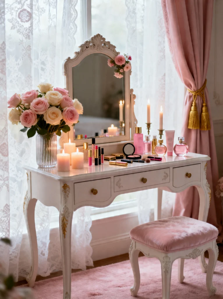 The styling here is so intentional. The tall taper candles, the array of perfume bottles, and the fresh roses in the ribbed glass vase—it’s a total mood. It reminds us that even the most functional parts of our room can be beautiful. By placing the vanity right in front of a window with lace curtains, you get that gorgeous diffused natural light that makes everything look filtered. If you have a small space, a dedicated “beauty nook” like this can make your whole apartment feel more luxurious.