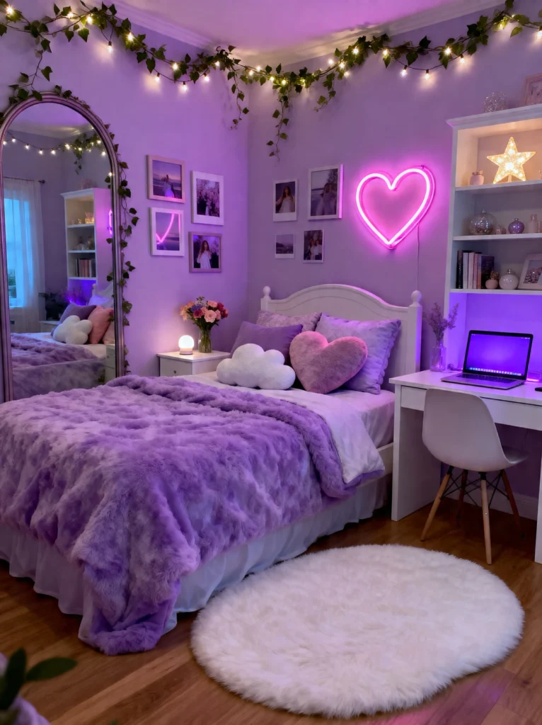 Switching gears to a different color palette! Purple is such an underrated color for bedrooms. It’s calming like blue but has that creative, regal energy. This room is a “Gamer-Girl” or “Lo-fi” lover’s paradise. The neon heart and the purple LED backlighting give it such a modern, tech-forward feel.