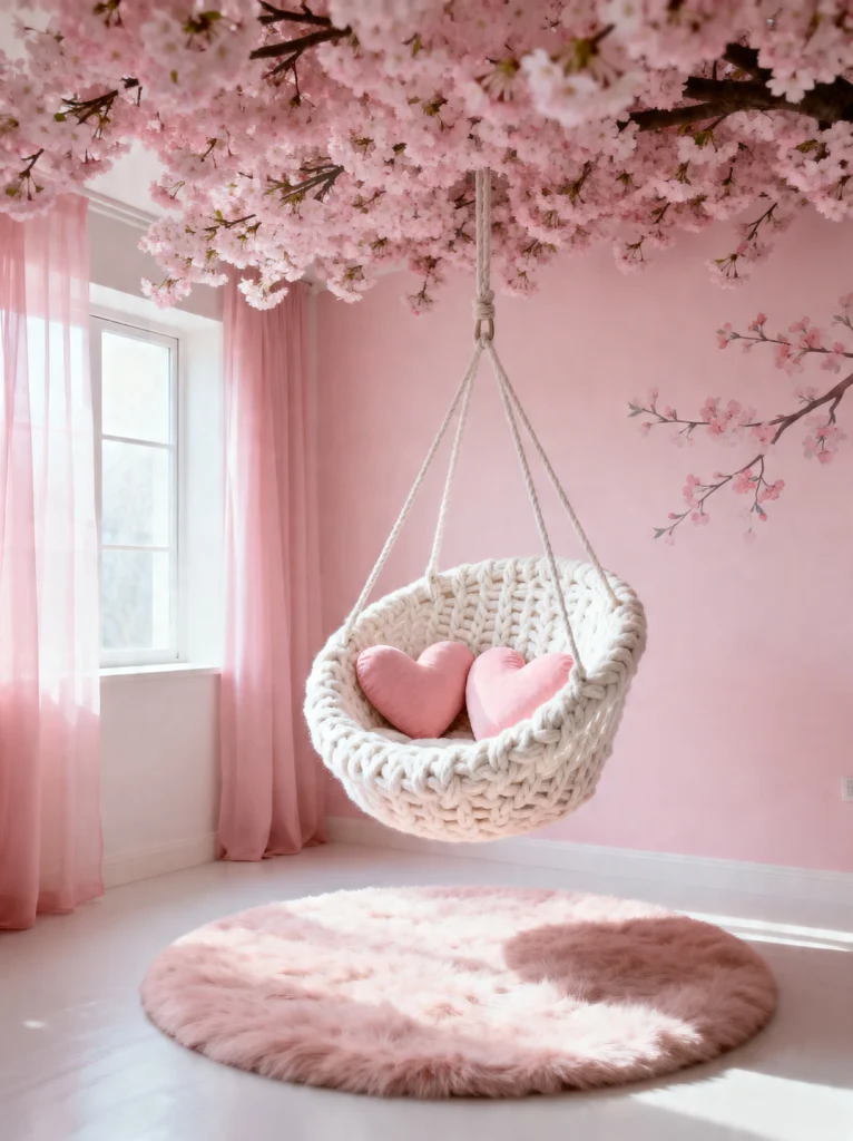 The minimalist approach to the rest of the room—the simple white floor, the sheer pink curtains, and the chunky white macramé swing—allows the tree to be the star of the show. Those heart pillows add just the right amount of “cute” factor. This room is a literal “Zen” space. It’s airy, bright, and incredibly peaceful. It proves that you only need one “wow” feature to make a room unforgettable. It’s the ultimate escape for anyone who wants to live in a permanent state of bloom.