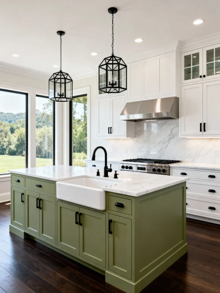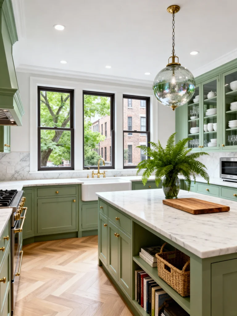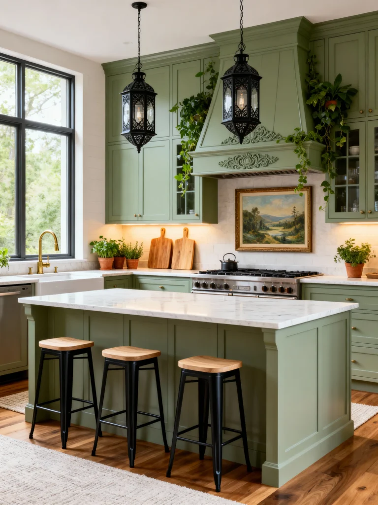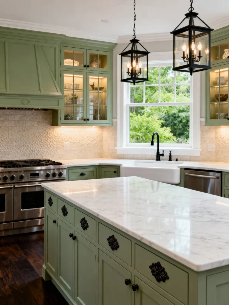 This design uses a slightly more “mossy” green, which looks incredible against the high-contrast white marble. The glass-front upper cabinets are a great way to show off your favorite dishes while keeping the room feeling open. And those lantern pendants? They’re huge, but because they’re glass and thin metal, they don’t block the view of the beautiful trees outside. It’s a very sophisticated, “grown-up” kitchen that feels incredibly timeless.