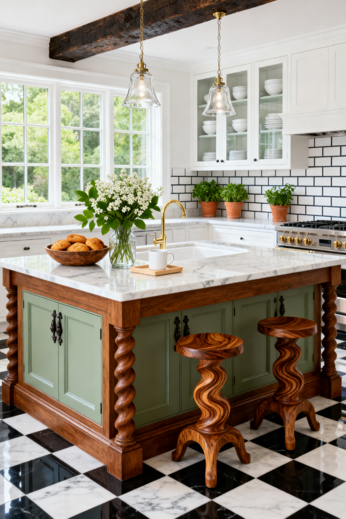 The twisted wood legs on the island and the matching stools give me such “European countryside” vibes. And check out that floor! The black-and-white checkered marble is a bold choice, but because the green on the island is a muted, earthy tone, it doesn’t feel like “too much.”