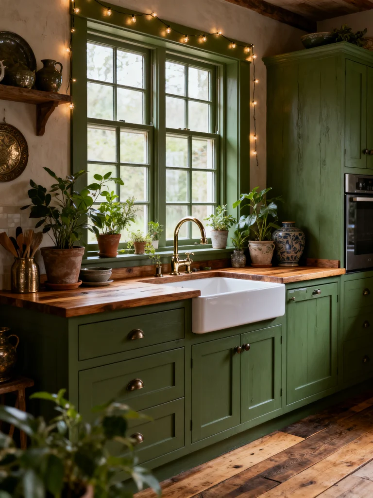This is the “moody cottage” dream. If you want your kitchen to feel like a cozy hug, this forest green is the way to go. Instead of stone, they’ve used warm butcher block countertops, which instantly makes the space feel more organic and lived-in.