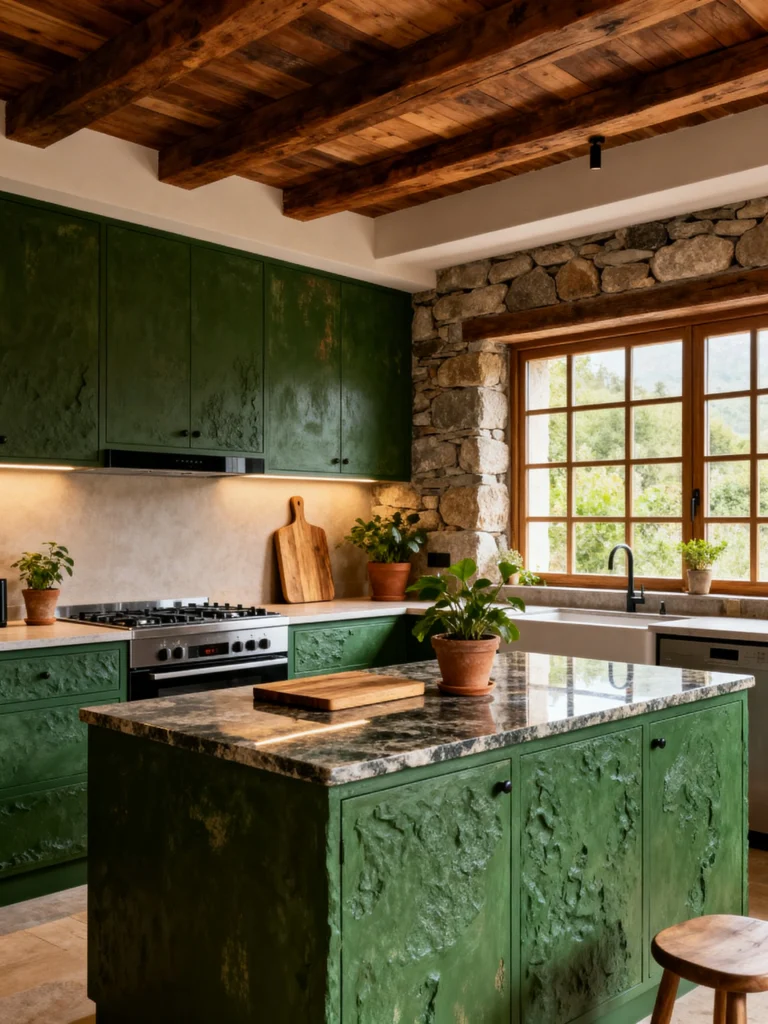 The deep moss green is paired with thick, dark marble on the island, which feels very “Old World.” The heavy wood beams on the ceiling add to that rustic, farmhouse-turned-villa aesthetic.
