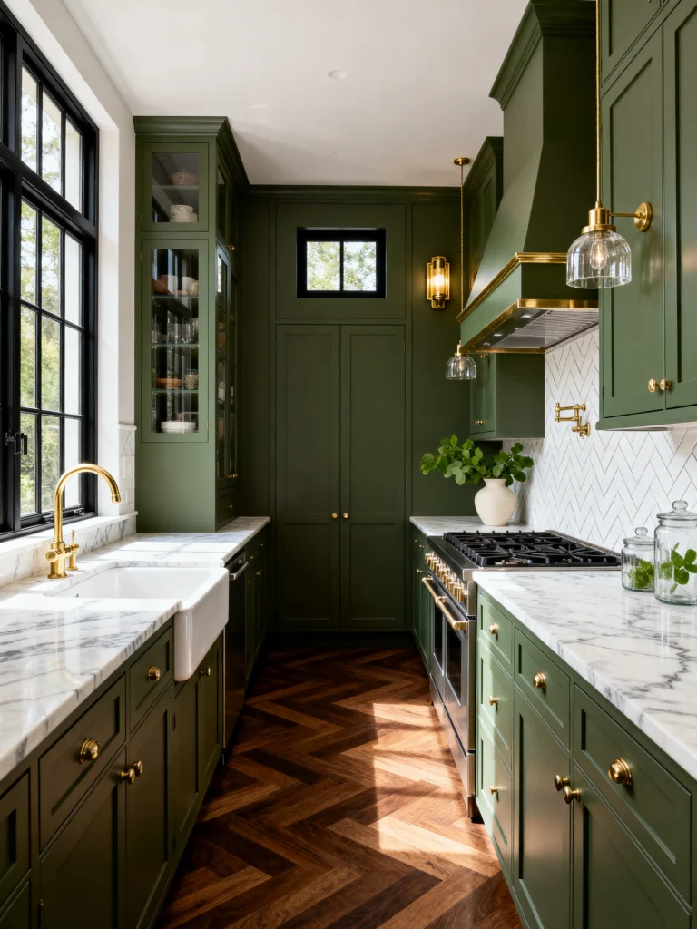 What really makes this space work is the herringbone wood floor. It adds a layer of warmth that prevents the green cabinets from feeling too “cool.” You’ll also notice that the designers went with a gorgeous white marble countertop and a classic farmhouse sink. This keeps the vibe traditional but fresh.