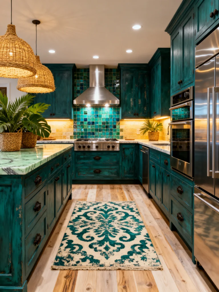 The small teal-and-white patterned rug is a “pro” move—it repeats the color of the cabinets on the floor, making the whole design feel intentional. This is a very “livable” way to do the teal trend.
