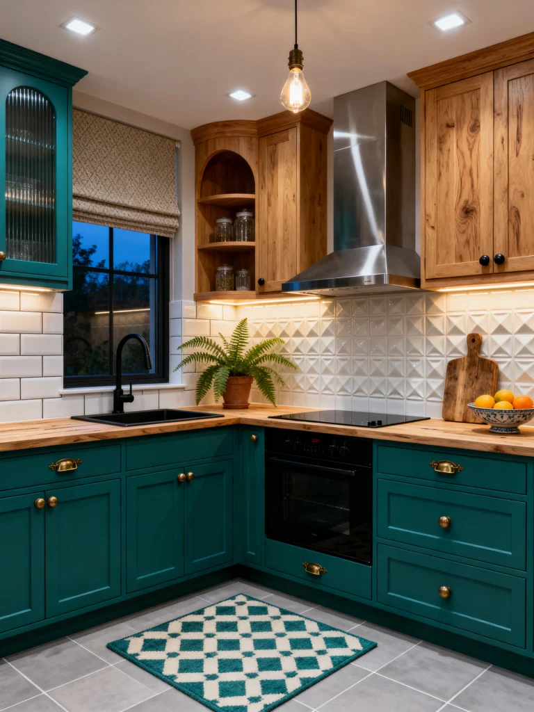 Let’s shift gears into the teal family. This kitchen is for the minimalist who still wants color. This deep teal (or “dark petrol”) is incredibly chic. By pairing it with light wood countertops and a white “penny tile” or textured backsplash, the kitchen stays looking modern and sharp.