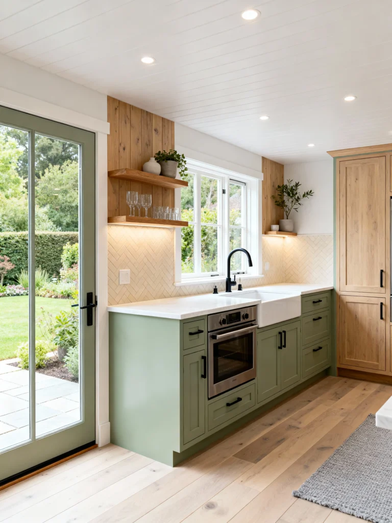 Now, let’s pivot to something a bit lighter. If you’re a fan of that clean, Scandi look, this kitchen is your spirit animal. Here, the green is used more as an accent on the lower cabinets, paired with beautiful, light-toned wood.