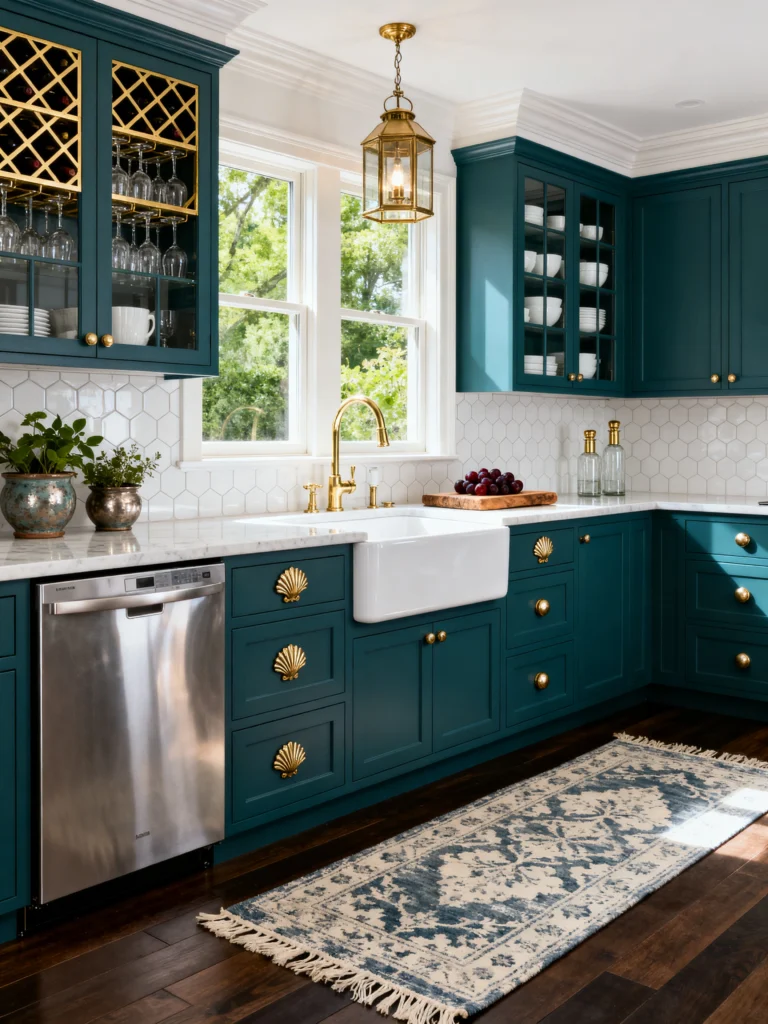 Finally, we have this stunning deep teal kitchen that is all about the hardware. Look at those gold shell-shaped drawer pulls! They are so whimsical and fun, and they instantly give the kitchen a “coastal luxury” vibe.