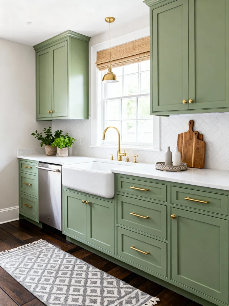 This first kitchen is the ultimate “breath of fresh air.” If you’re worried that a colored kitchen might feel too heavy or dark, this soft sage green is your perfect middle ground. It’s light, it’s airy, and it feels incredibly sophisticated.