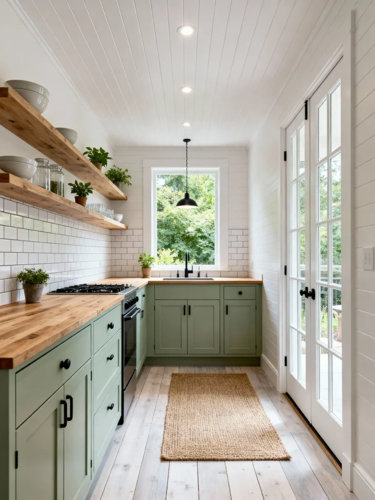 Proof that you don’t need a massive footprint to have a gorgeous kitchen! This galley-style space uses light sage green to keep the narrow layout from feeling cramped.