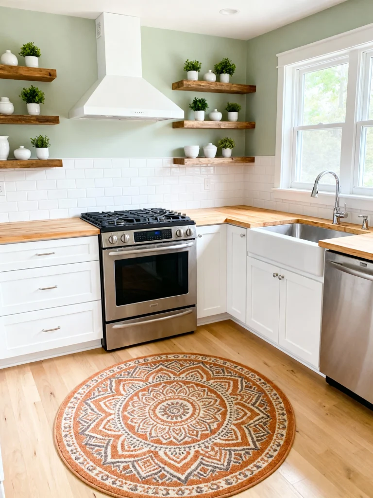 If you aren’t ready to commit to a full-on green kitchen, let this be your sign to try a colored island. This kitchen is a masterclass in mixing textures. You’ve got the white upper cabinets keeping everything bright, but then you have this stunning wood-and-green island that anchors the whole room.