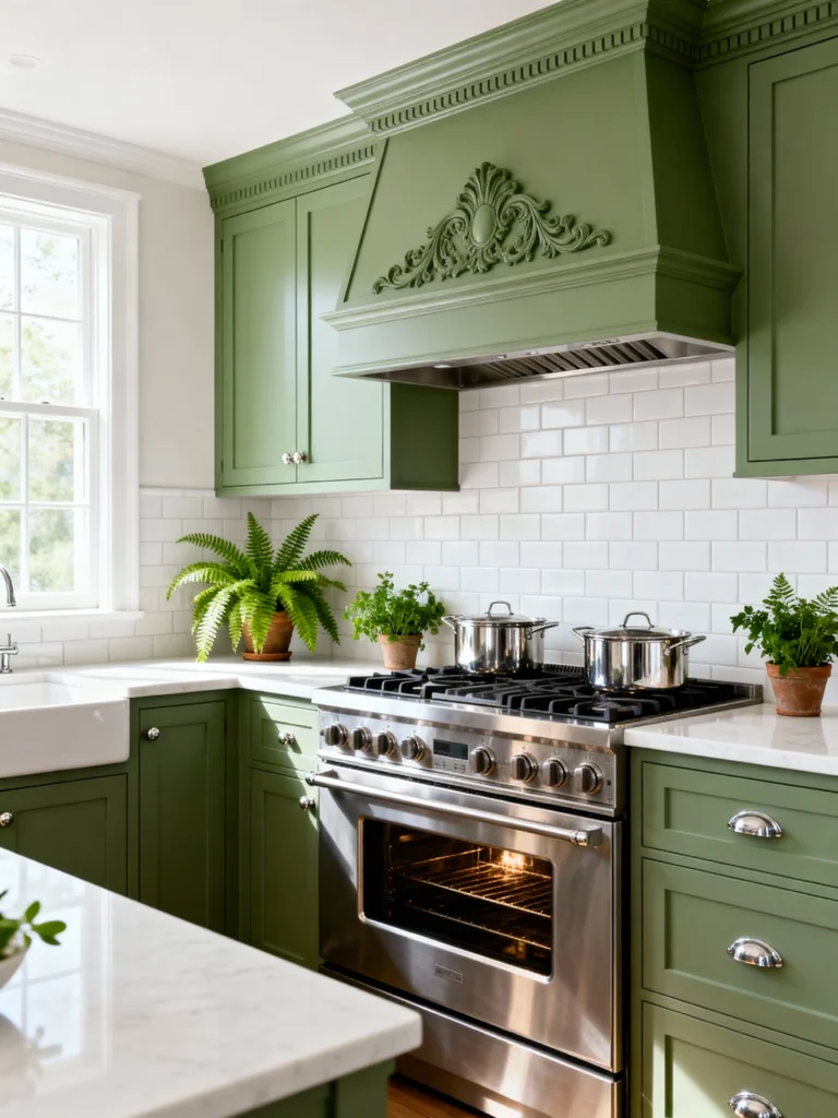 This is the “chef’s kitchen” version of the green trend. It’s professional but pretty. The focus here is clearly on that massive stainless steel range, framed by those stunning green cabinets and a classic white subway tile backsplash.