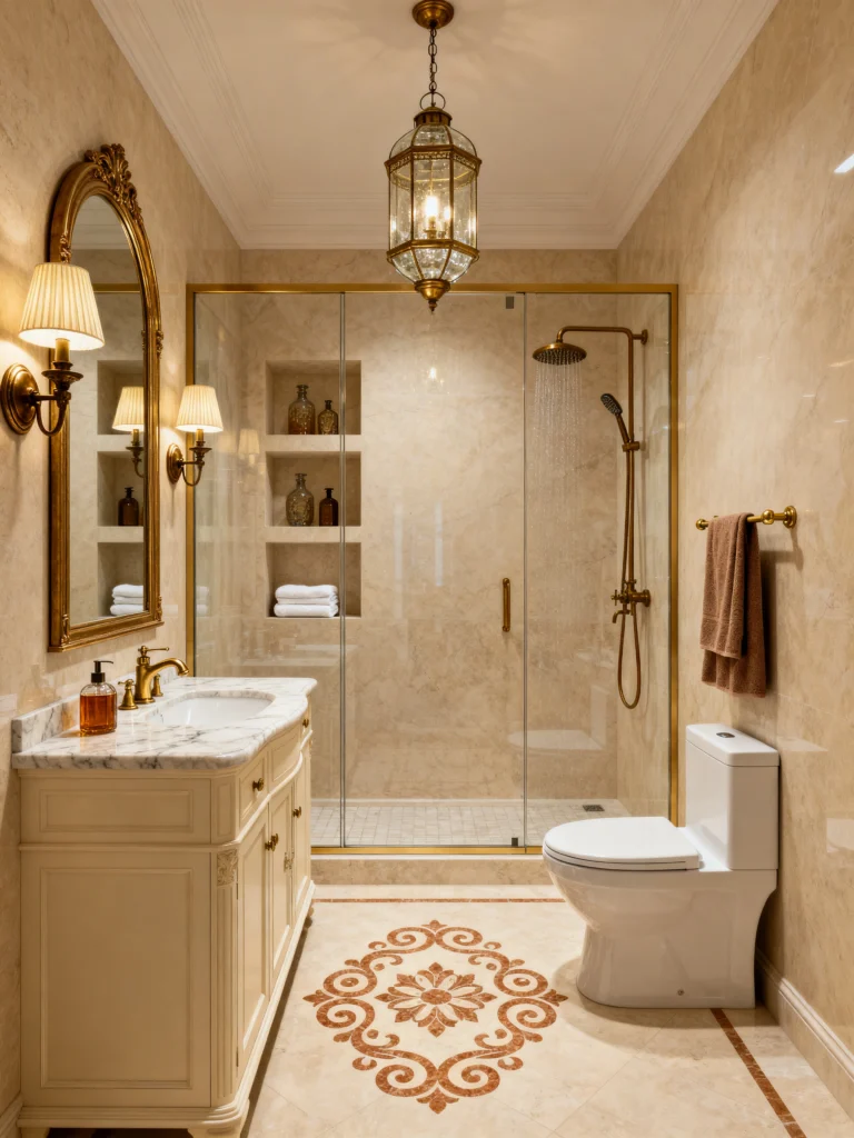 I love how they used warm, creamy tones for the marble and the vanity. It’s not that clinical “hospital white” you see in a lot of modern bathrooms. Instead, it feels lived-in and luxurious. The built-in shelving inside the shower is a genius touch—it’s so much sleeker than those hanging wire racks, right? Plus, that intricate tile inlay on the floor acts like a permanent rug that you never have to vacuum. It’s elegant, cozy, and honestly, I’d never want to leave that shower.