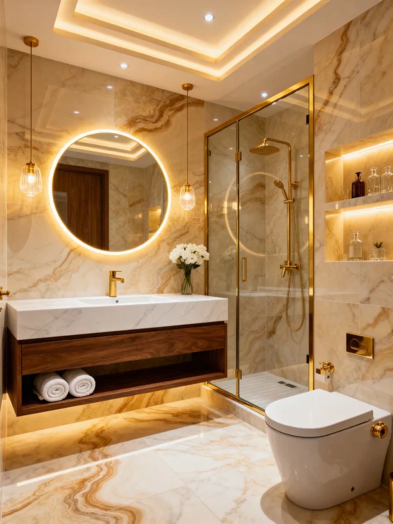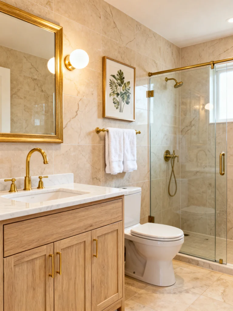 Okay, can we talk about this bathroom? It’s basically a jewelry box you can shower in. If you’re a fan of warm tones, this is the blueprint. The marble on the walls and floors has these gorgeous, sweeping veins of gold and tan that make the whole room feel like it’s glowing from the inside out.