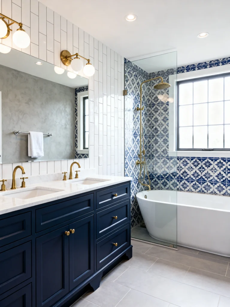 I’m obsessed with the tile work here. You’ve got that classic white vertical subway tile on the main walls, but then the shower and tub area features this stunning blue and white patterned tile. It adds a bit of a Mediterranean or farmhouse-chic vibe that keeps the room from looking too plain.