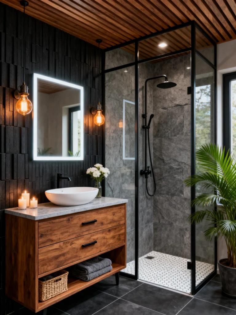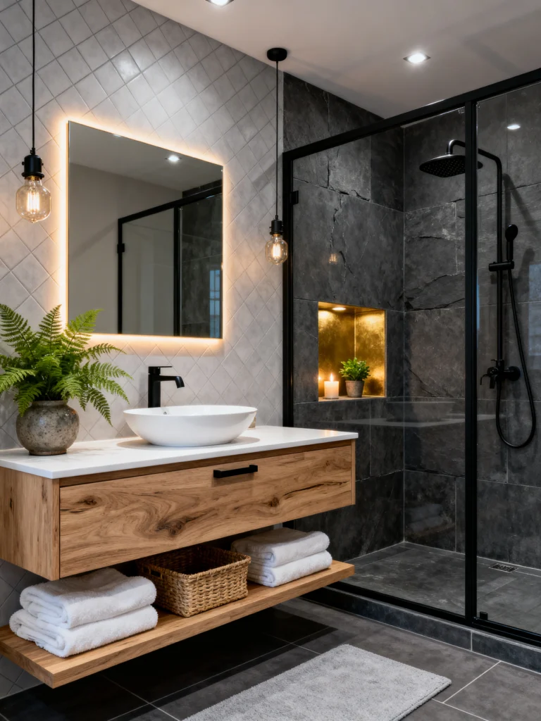 Let’s lean into something a little more dramatic. This bathroom uses dark, slate-grey stone in the shower to create a really cool, moody atmosphere. It’s a total contrast to the light, diamond-patterned tile behind the vanity, and that’s exactly why it works. It’s all about the balance of light and dark.