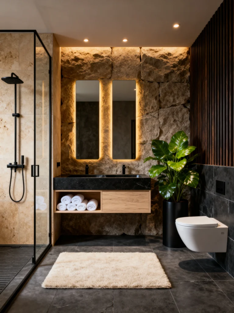 The rest of the room stays very minimal to let that stone wall shine. You’ve got a sleek black vanity top and dark, large-format floor tiles. It feels very grounded and masculine, but the addition of that huge, leafy green plant in the corner softens it up perfectly.
