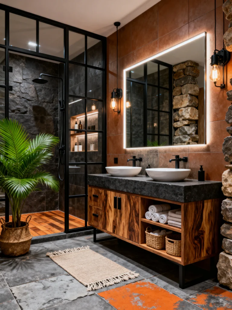 I also love the wooden slat wall on the right. It adds a bit of a Japanese “zen” influence. This isn’t just a bathroom; it’s an experience. It’s bold, it’s earthy, and it’s a total masterclass in using natural materials.