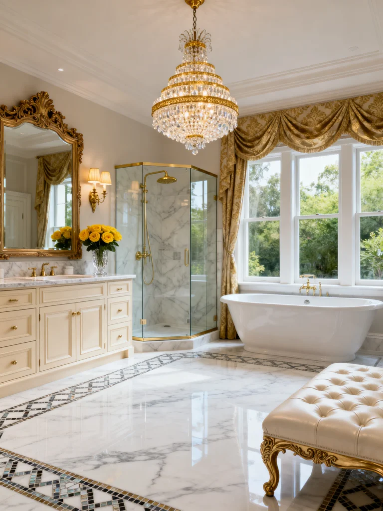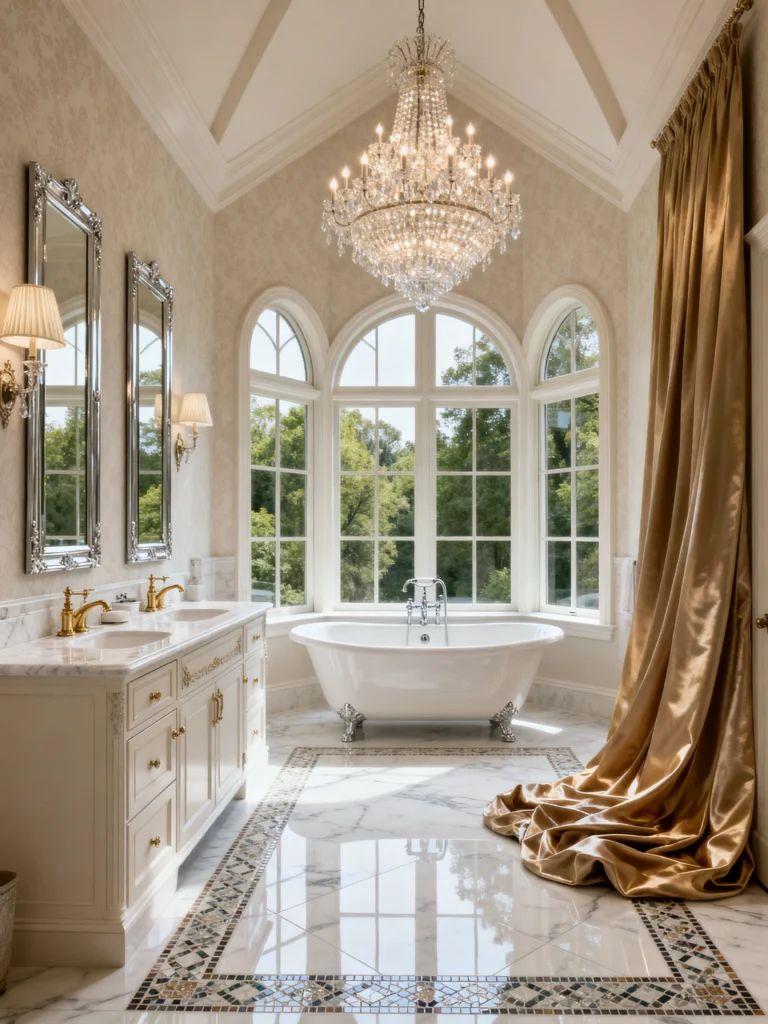 Okay, if you want to feel like royalty while you’re brushing your teeth, this is the one. This room is absolutely massive! The first thing you notice is that giant crystal chandelier—it’s definitely a statement piece. But look at the details: the gold-framed mirror is so ornate, and it pairs beautifully with the floral drapes.
