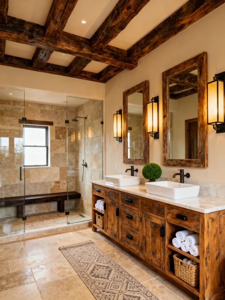 This bathroom feels like a high-end ski lodge. Those massive, dark wood ceiling beams are the first thing you notice, and they give the room so much warmth and history. The double vanity is made of beautiful, reclaimed-style wood that looks like it has a thousand stories to tell.