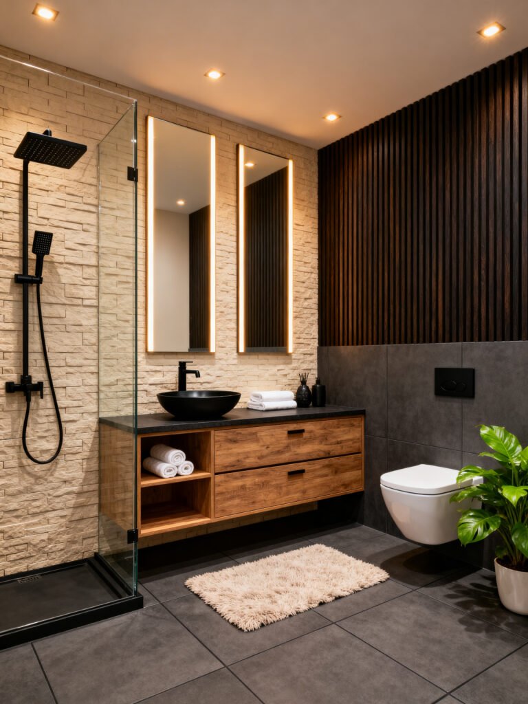 Finally, we have this ultra-modern, clean-lined masterpiece. This is for the person who loves a clutter-free, organized life. The stacked stone wall behind the vanity adds just enough texture to keep the room from feeling too sterile, while the dark wood slats on the opposite wall bring in that “zen” vibe.