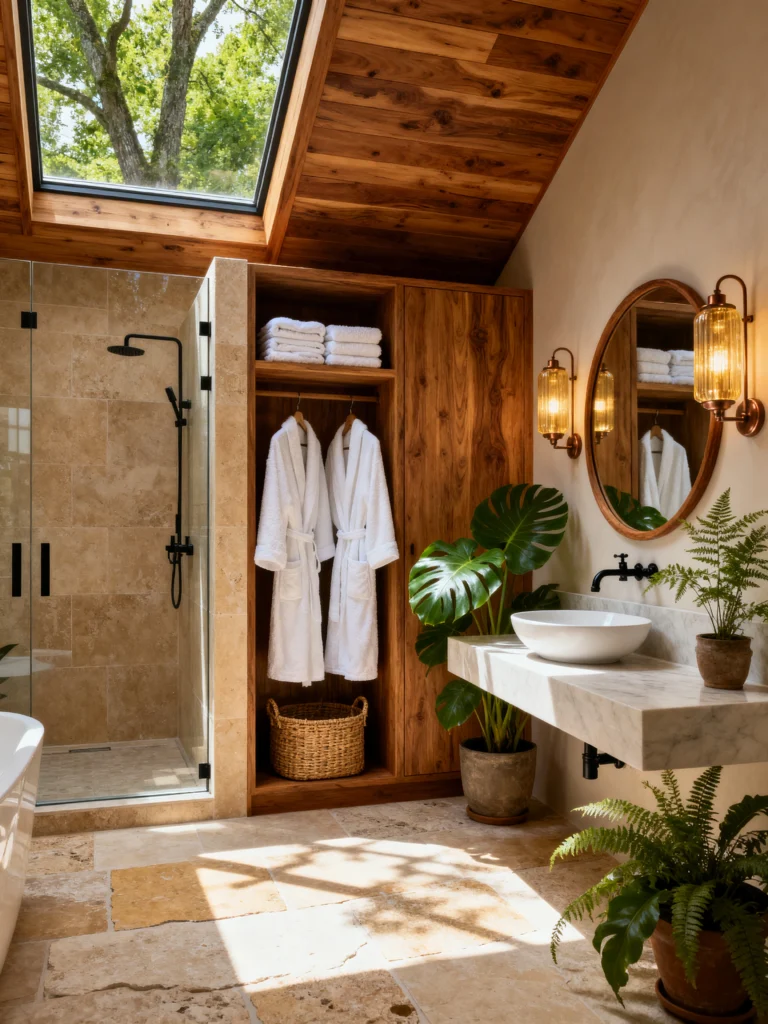 This bathroom is all about that “organic modern” feel. It’s incredibly calming because it uses a very soft, monochromatic palette. The light tan stone tiles cover the walls and floors, creating a seamless look that makes the bathroom feel bigger than it actually is. It’s proof that you don’t need a massive room to have a luxury feel.