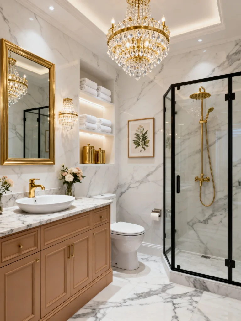 This is a masterclass in how to use marble without it feeling overwhelming. By mixing it with a warm, taupe-colored vanity, the room feels soft and inviting. The gold hardware and that stunning chandelier add just the right amount of sparkle. It’s elegant without trying too hard.