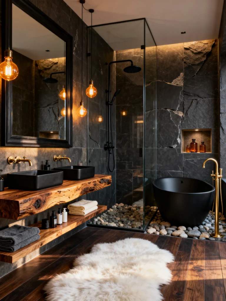 The lighting is so intentional here, too. Those Edison bulbs hanging over the sinks give off such a warm, amber glow that highlights all the different textures. And that fluffy white rug on the dark wood floor? It’s the perfect touch of softness in a room full of hard surfaces. It’s dramatic, mysterious, and incredibly cozy all at once.