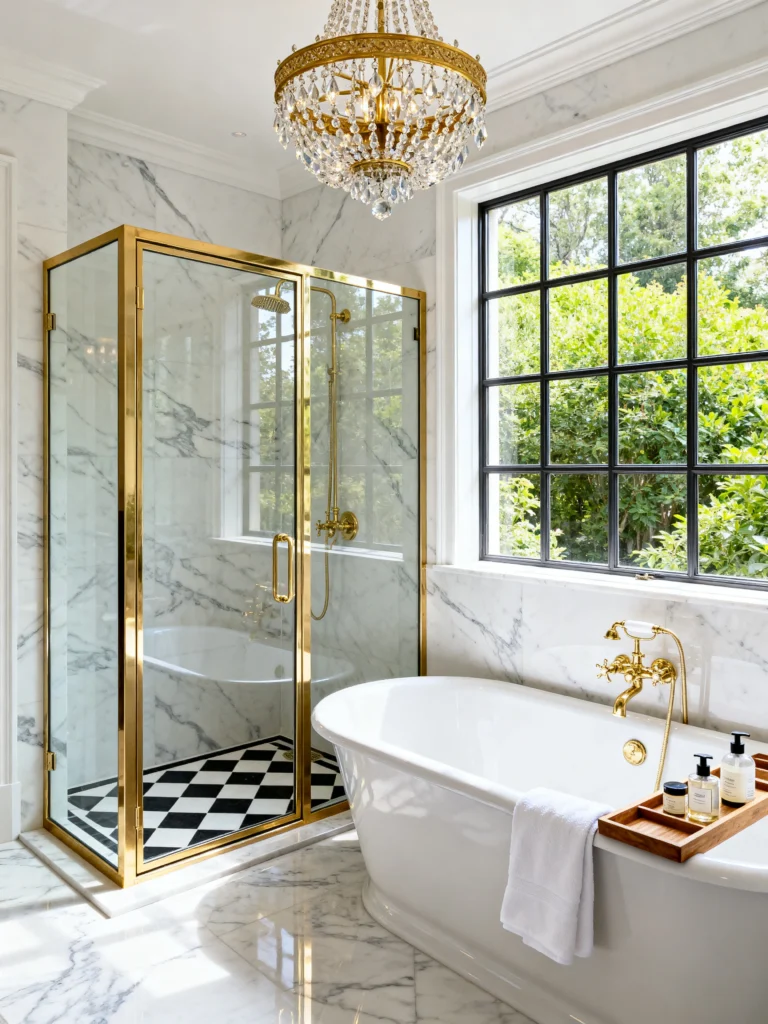 This is pure, clean elegance. If you like a bathroom that feels fresh and breezy, this is your winner. The white marble with the light grey veining is so timeless. But the real “wow” factor is the gold-framed shower next to the white tub. It feels very high-end and curated.