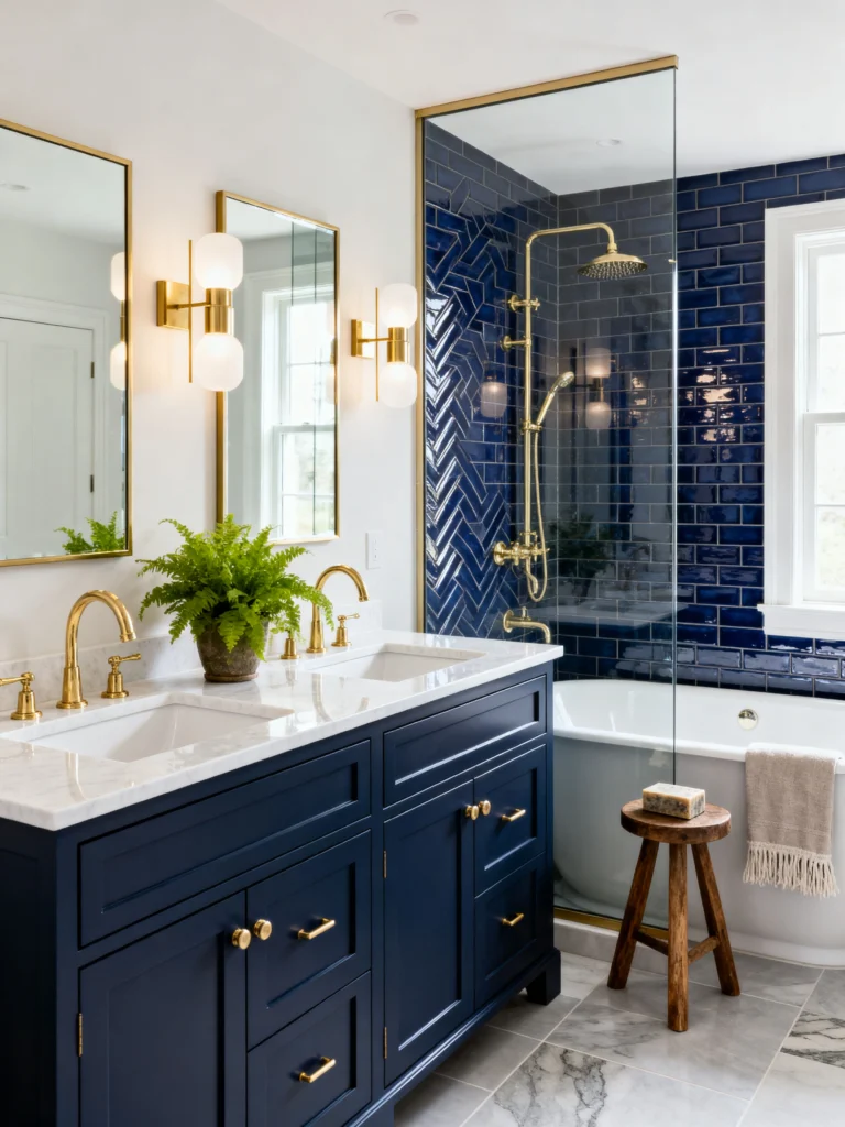 I am obsessed with this color! Using navy blue in a bathroom is such a great way to add depth without going full-black. Those deep blue tiles in the shower, especially in that herringbone pattern, are absolutely stunning. They reflect the light so well and make the gold fixtures really stand out.