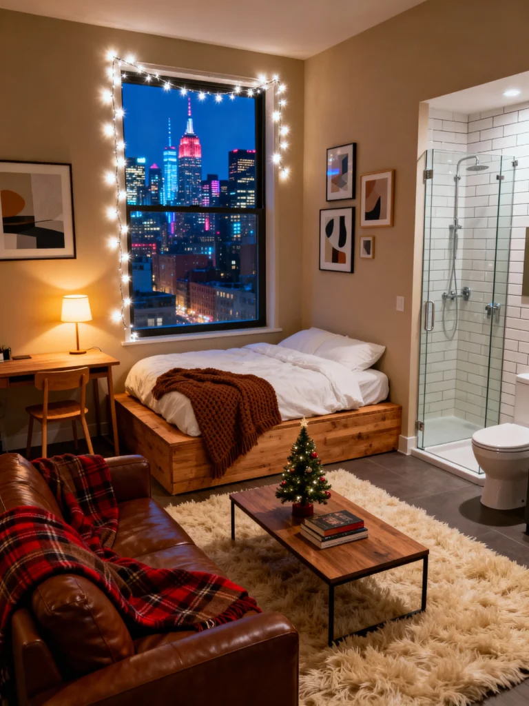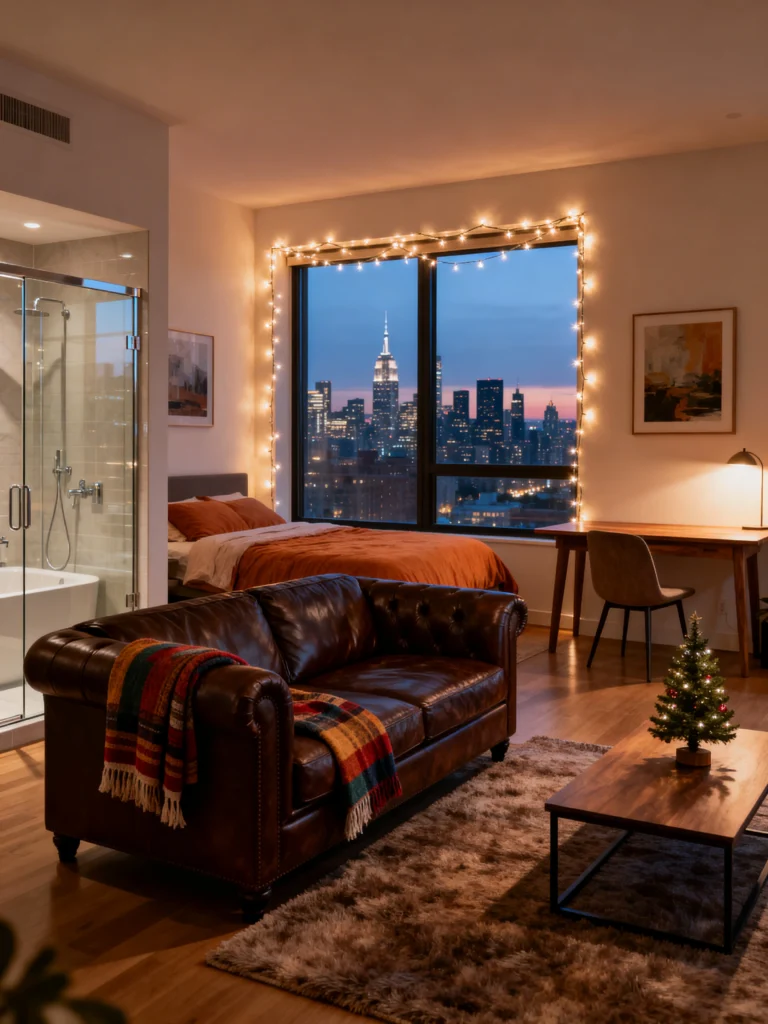 I love how the owner mixed textures here—that deep, chocolate-brown leather Chesterfield sofa looks so lived-in and comfortable, especially with the striped wool throw. Even though it’s a studio, the glass shower wall keeps the space feeling open and airy. It’s a little bit masculine, a little bit festive (check out that tiny tree!), and 100% cozy. It’s the kind of place where you’d want to pour a glass of wine and just watch the city lights flicker.