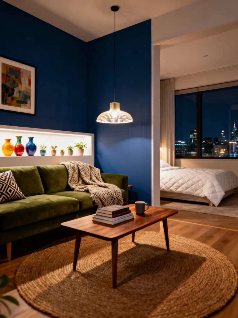If you’re afraid of dark colors in small spaces, let this room change your mind. That deep, moody blue wall is such a bold choice, and it pays off beautifully. It creates this incredible “enclave” feeling for the living area. The forest green velvet sofa paired against the blue? Chef’s kiss.