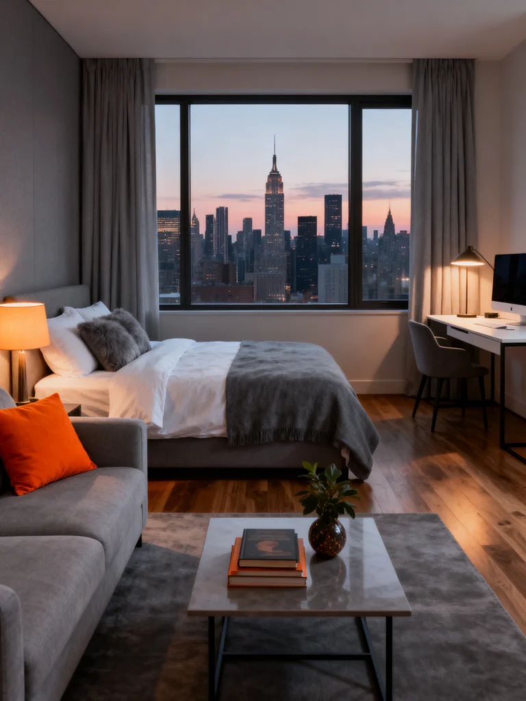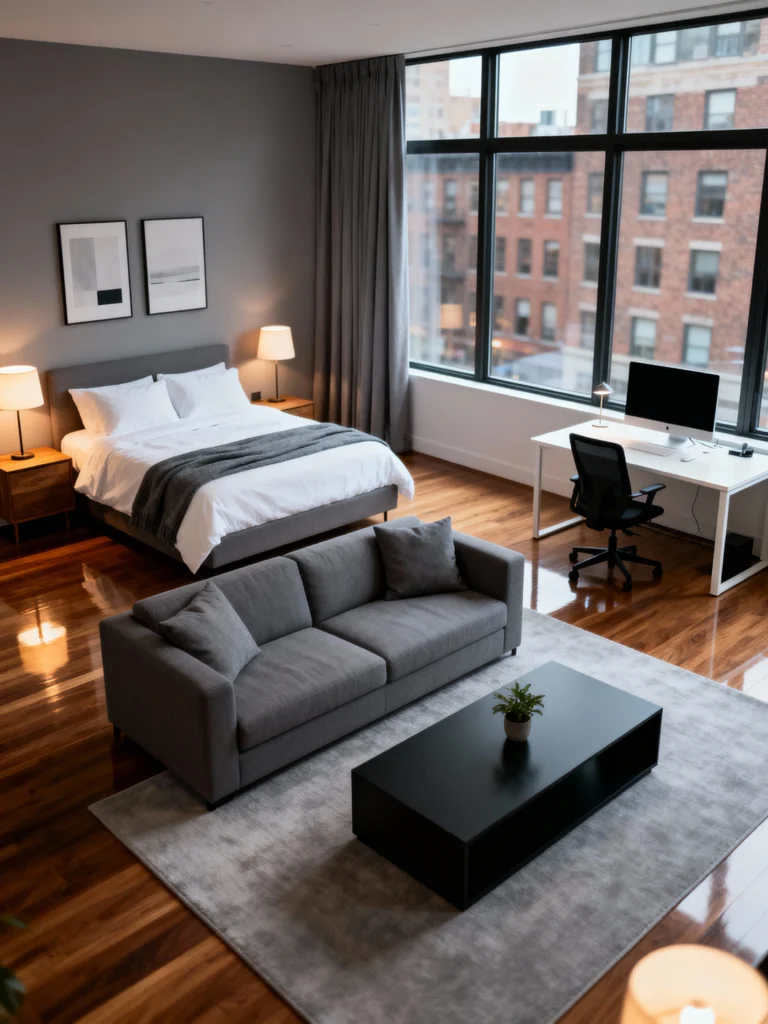 Sometimes, simple is best. This studio uses a grayscale palette to keep things looking organized and intentional.The shiny hardwood floors reflect the light from those massive windows, making the whole place glow. It’s very “executive living.” The desk is positioned right by the window, which is a total pro tip—having a view of the city while you’re on Zoom calls definitely beats staring at a blank wall.