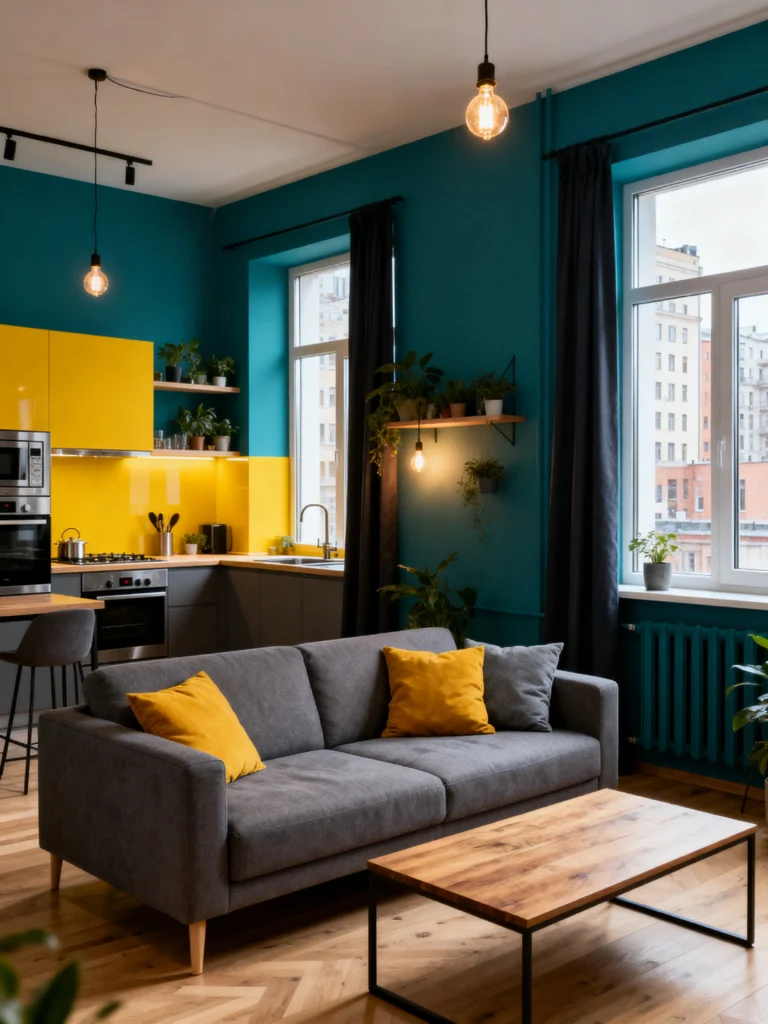 We’re back to those gorgeous teal walls, but this time with a tufted dark sofa that screams “luxury.”I love how the kitchen is integrated right into the living space. The open shelving with the wine glasses makes it feel like a cool neighborhood bar. The pops of yellow pillows against the dark velvet keep things from feeling too heavy. It’s moody, sophisticated, and very “cool girl/guy” chic.