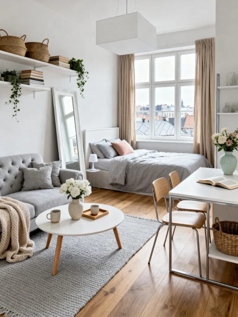 What makes this work is the “softness”—the chunky knit throw, the linen bedding, and the fresh flowers everywhere. It doesn’t feel cold or clinical; it feels like a big hug. It’s the perfect example of how to live “small” without it feeling cramped. Every piece of furniture has breathing room, and those high windows let the light bounce everywhere.