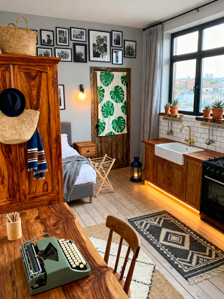 I love the “collected” feel of this room—the gallery wall of black-and-white photos, the vintage-style typewriter on the desk, and the monstera-print curtain. It feels like a place where a writer or a traveler lives. It’s not trying to be perfect; it’s trying to be real. The under-cabinet lighting in the kitchen is a genius touch, too—it makes the wood glow.