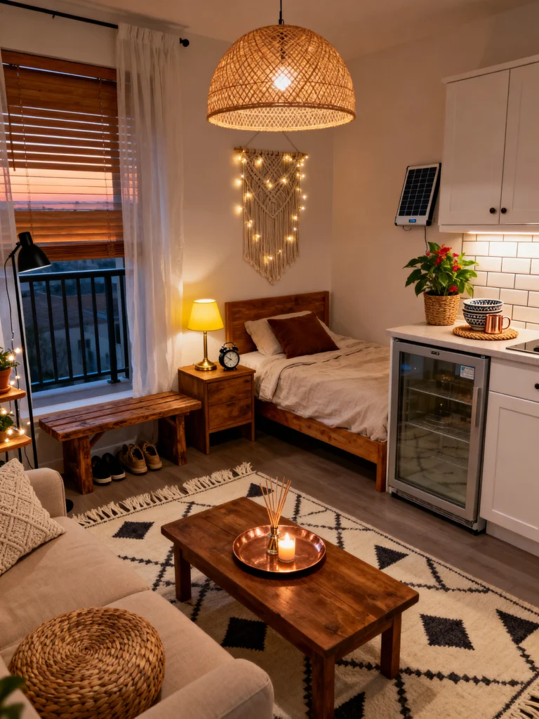 The mix of natural materials—wicker, wood, and jute—makes it feel incredibly cozy. Even though the bed is right next to the kitchen prep area, the use of rugs and lighting helps define the different “zones” of the room. It’s warm, it’s glowing, and it’s a perfect little sanctuary from the outside world. It proves that even a single room can feel like a complete home.