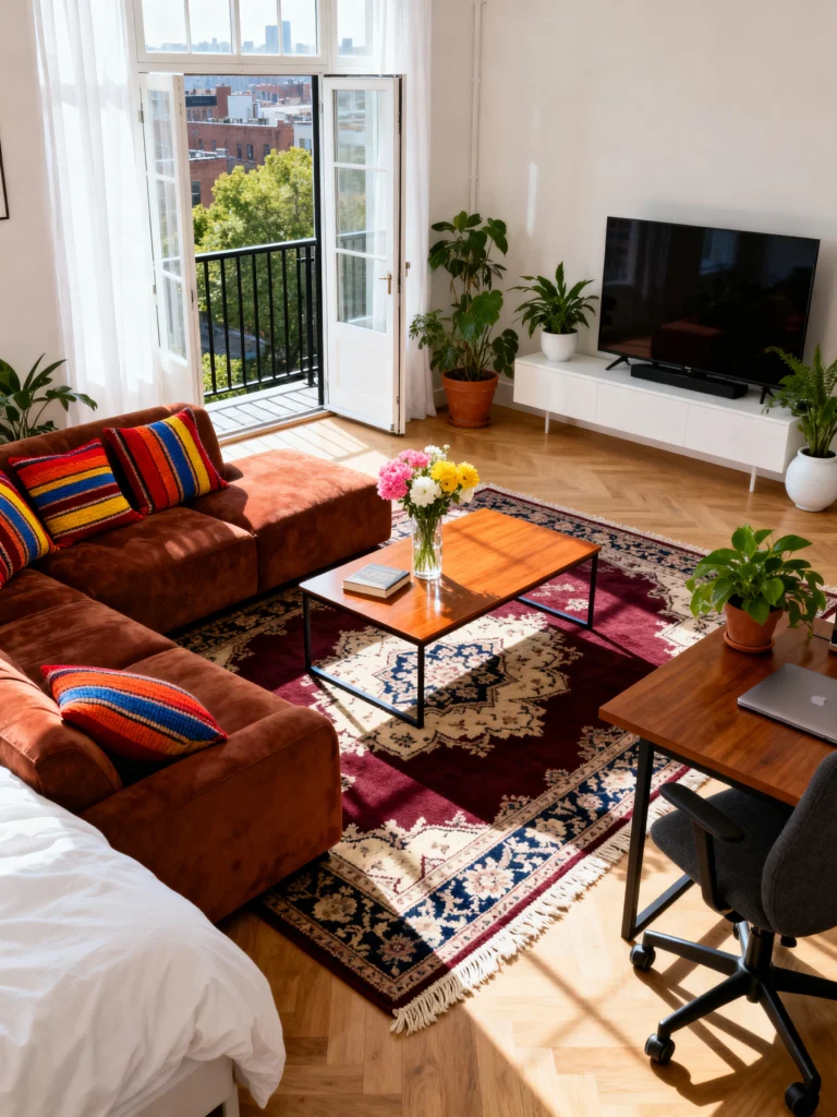 Finally, we have this gorgeous, airy setup. Those French doors opening onto the balcony are an absolute dream—bringing the outdoors in is the best way to make a room feel bigger. The herringbone wood floors add so much elegance to the space.