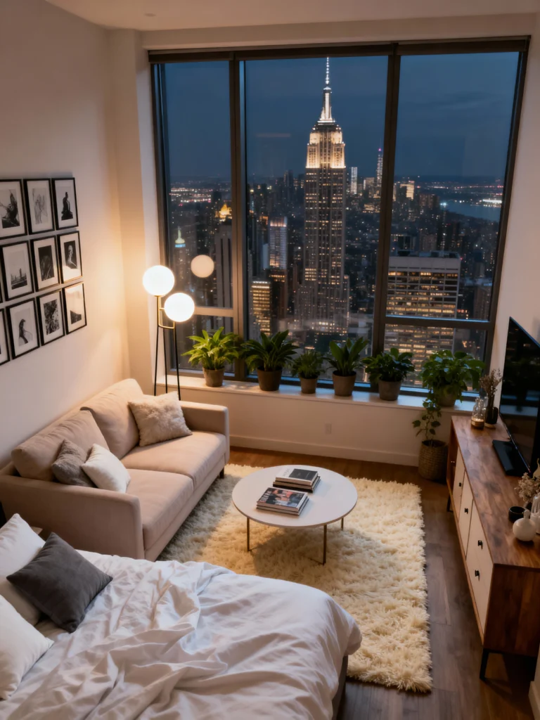 Can we just take a second for this view? Imagine coming home after a long day in the city, switching off the overhead lights, and letting the string lights do their magic. This space is the definition of “mood lighting.” The way the Empire State Building perfectly aligns with the window makes the whole room feel like a private VIP lounge.