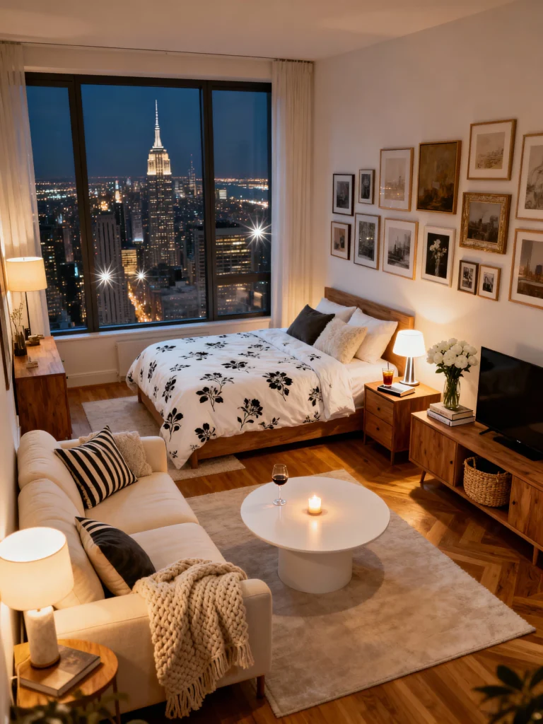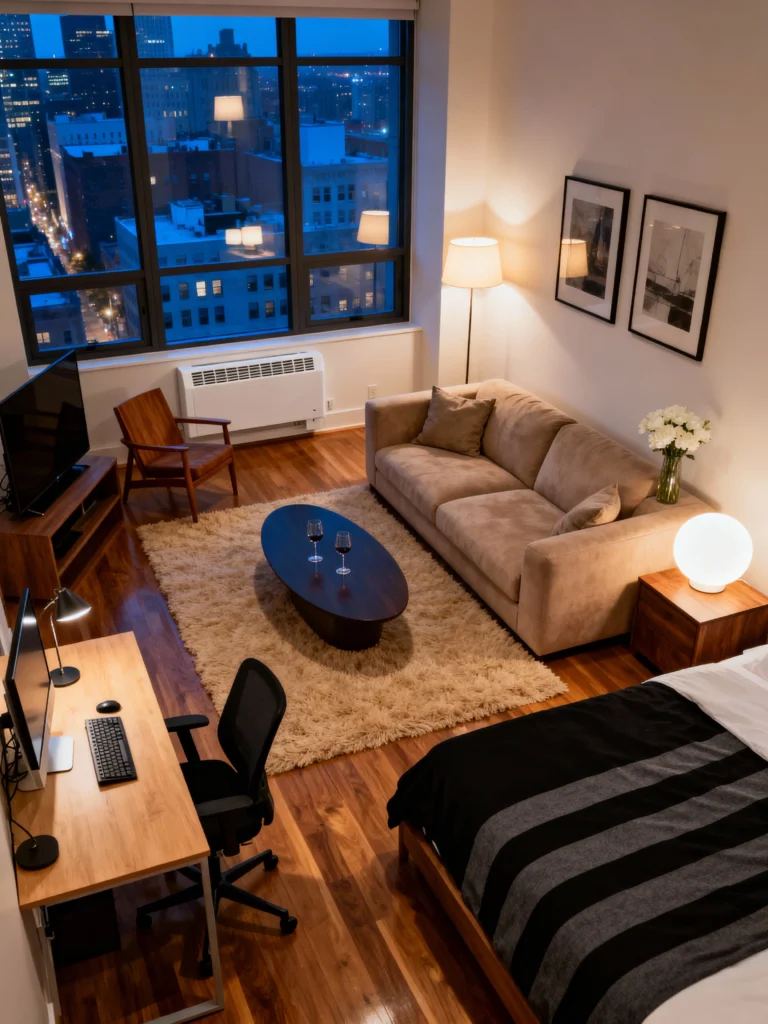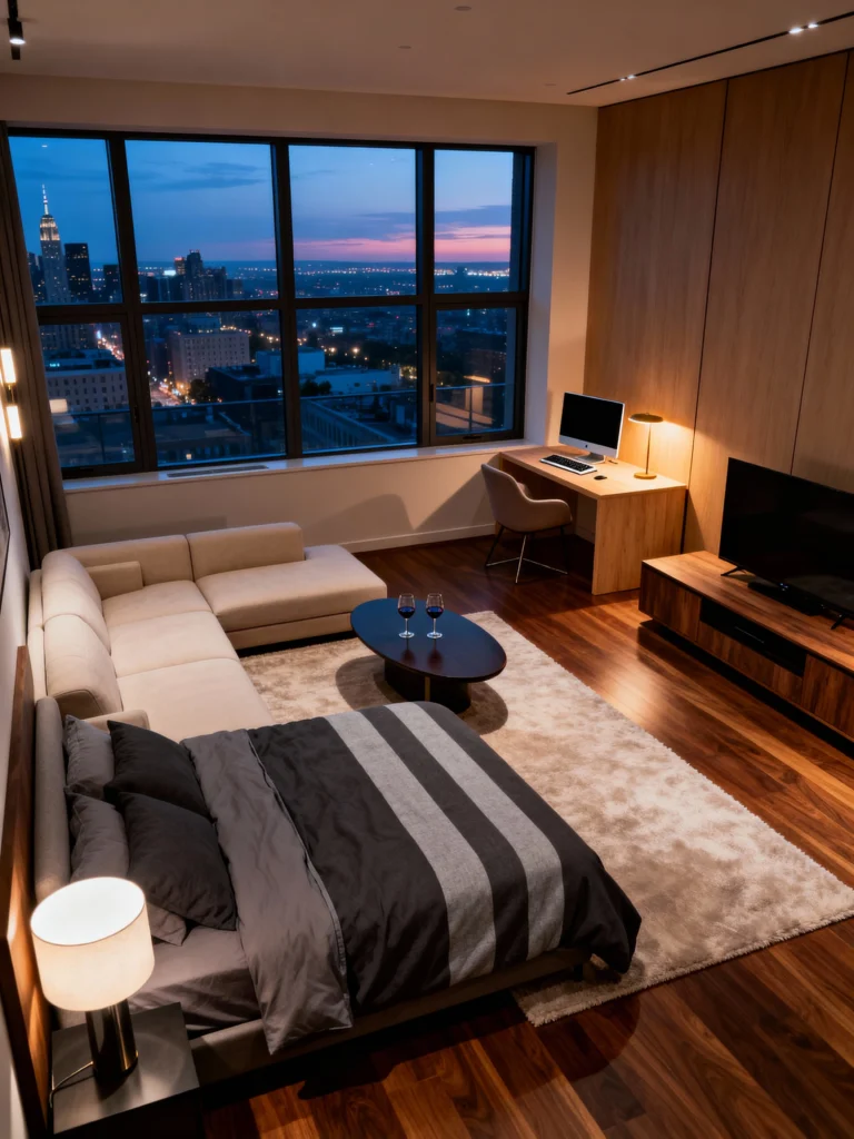 The “L” shaped sofa is a smart move here; it carves out a distinct lounge area without needing a physical wall. With those two glasses of wine on the table and the sun setting over the skyline, it’s basically the most romantic studio apartment I’ve ever seen.