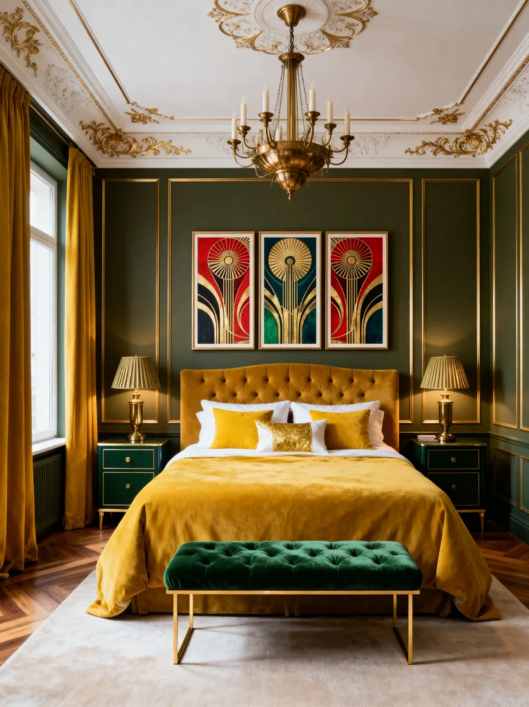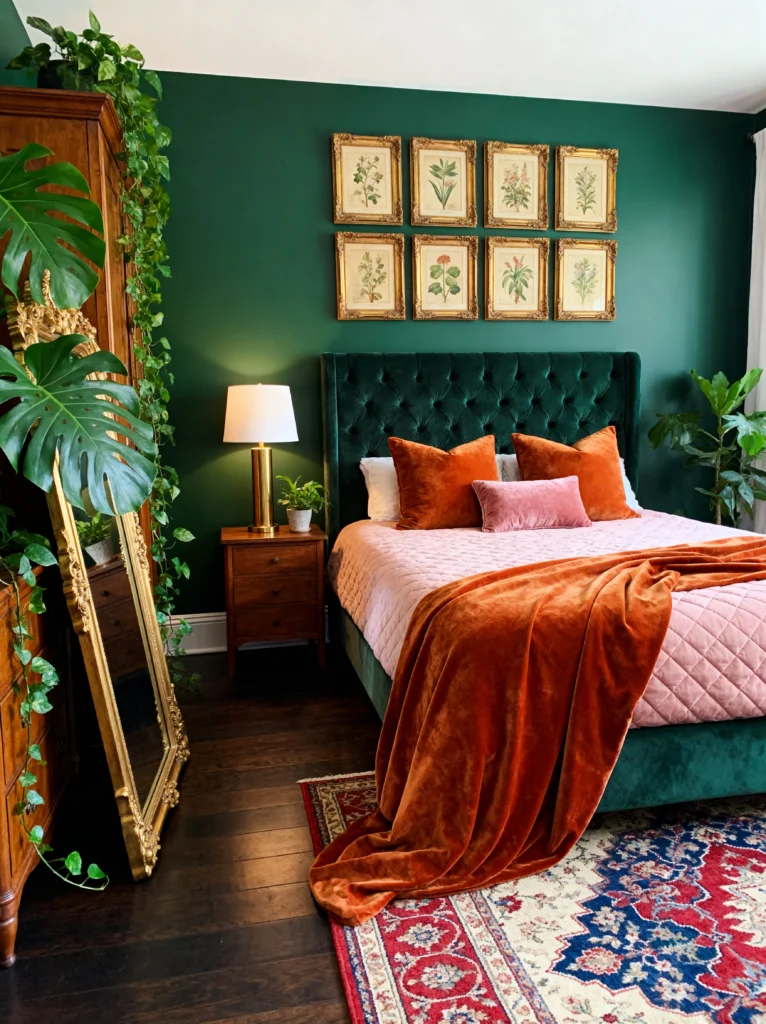 The furniture is very “Old World” with the ornate wooden dresser and the vintage-style mirrors, but the mustard-yellow velvet bed brings it right into the modern day. It’s a total mix of styles—bohemian, classic, and eclectic—all living together in one space. It’s the kind of room that feels like it has a hundred stories to tell. It’s brave, it’s colorful, and I love how the red rug anchors everything.