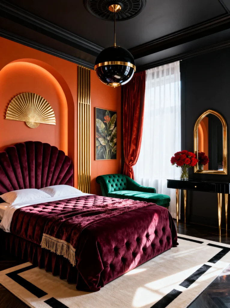 The ceiling is painted black, which might sound scary, but here it makes the room feel like an intimate, high-end lounge. And check out that gold fan wall decor—it adds just the right amount of Art Deco flair. The emerald green chaise in the corner is the “chef’s kiss” of color theory, adding a cool contrast to all that warmth. It’s fancy, it’s moody, and I’m obsessed with how the natural light hits that velvet.