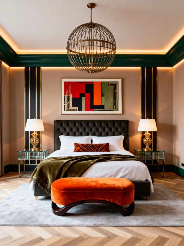The star of the show is definitely that giant cage-like spherical chandelier hanging right in the center. It’s massive, but because it’s airy, it doesn’t feel heavy. I love the pops of orange—the bolster pillow and that velvet bench at the foot of the bed. It keeps the neutral beige walls from feeling too quiet. This is exactly how you do “Luxe Modern” without losing your personality. It feels organized, expensive, and super calming.