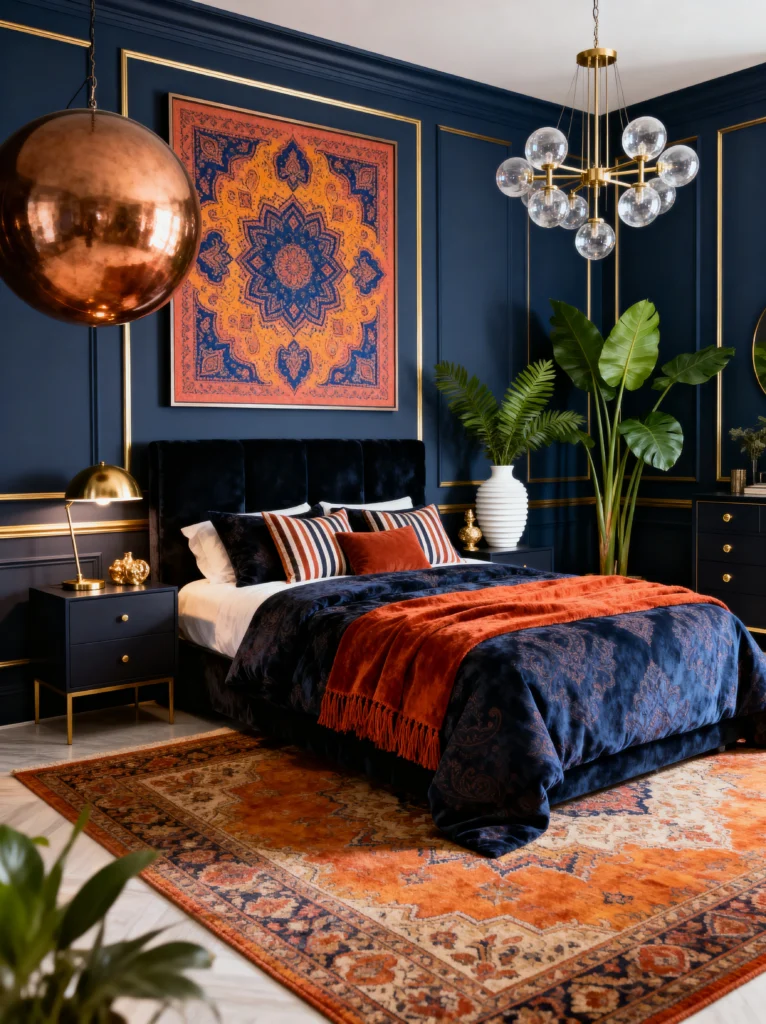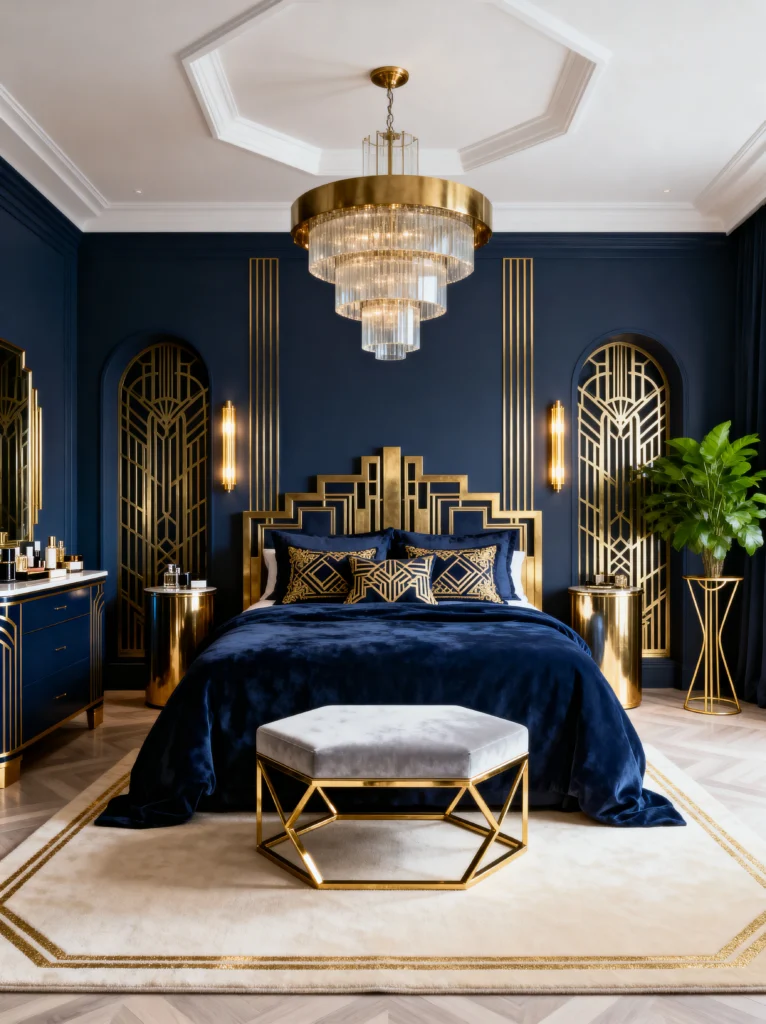 This is pure, unadulterated Art Deco glamour. If you want to feel like royalty every time you wake up, take notes. The navy blue walls are so deep they’re almost infinite, providing the perfect stage for all that gold.