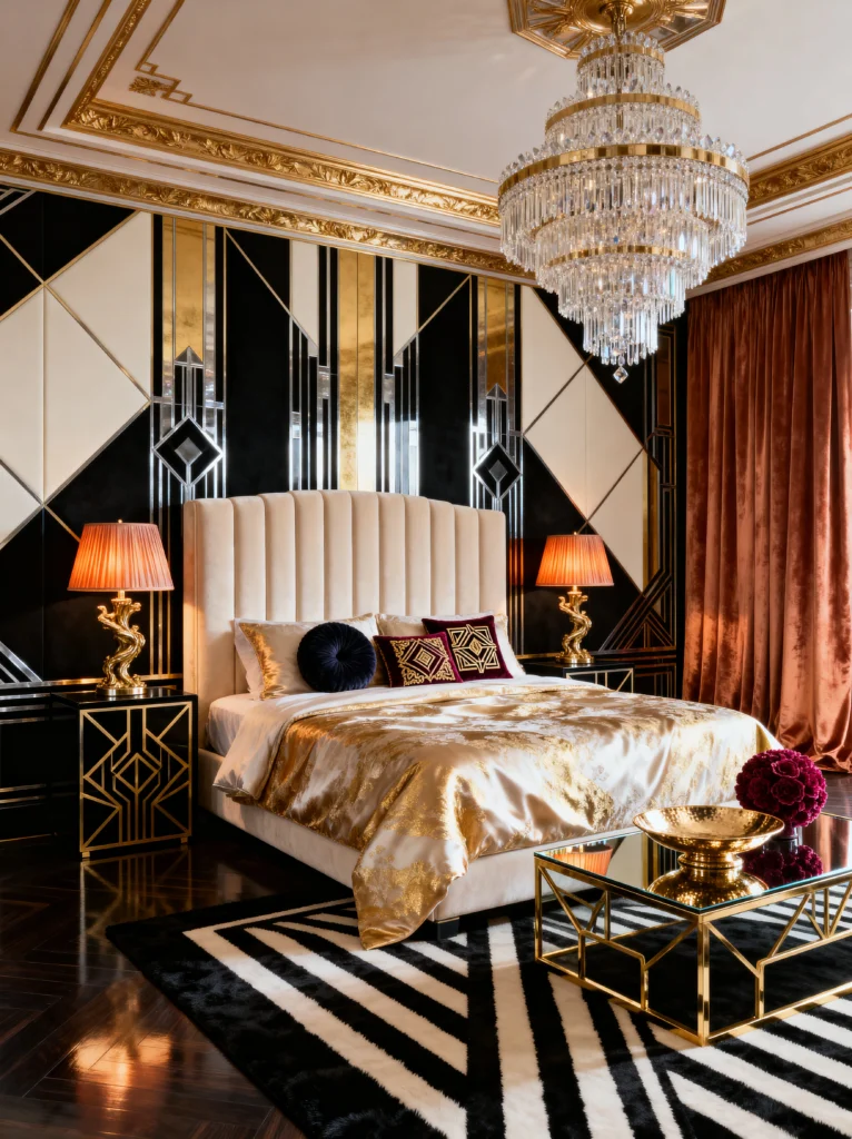 Wow. If Great Gatsby had a modern-day penthouse, this would be the bedroom. That accent wall is a literal work of art—black, white, and gold geometric panels that scream Art Deco luxury. It’s sharp, it’s bold, and it makes the cream-colored tufted headboard look even softer by comparison.